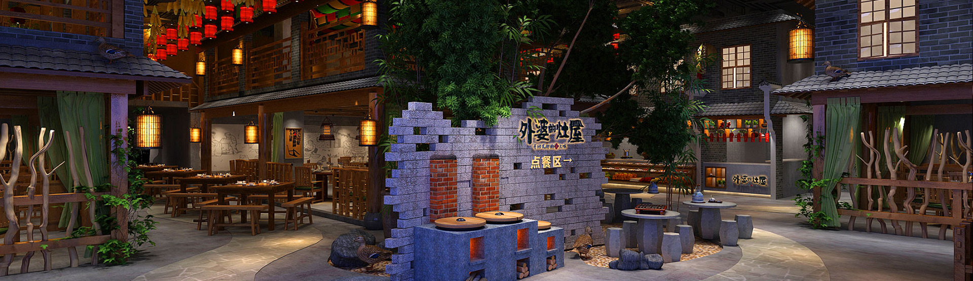 在空间设计上,我们力求呈现最佳效果。大面积的门头招牌将品牌的底气展路无遗,让人一目了然。在室内,设计师合理布局各个位置,融入与品牌调性一致的怀旧、村落、农家等元素,重现儿时的乡土场景,创造舒适、古老而接地气的体验;导视系统也根据乡土、外婆家等设定进行了对应的设计,以增强消费者的代入感。顾客来店消费,就会像是走进一座袖珍的小村子里,游赏后可坐下来饱餐一顿,感怀往昔的岁月时光,最后还能买点土特产满意而归。